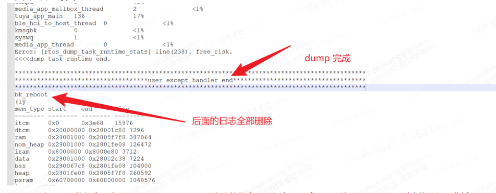 - 日志里面只能包含一份 dump 日志。(dump 完成后,设备会重启,可能会进行二次 dump 打印,所以需要删掉其他多余,搜关键字:user except :