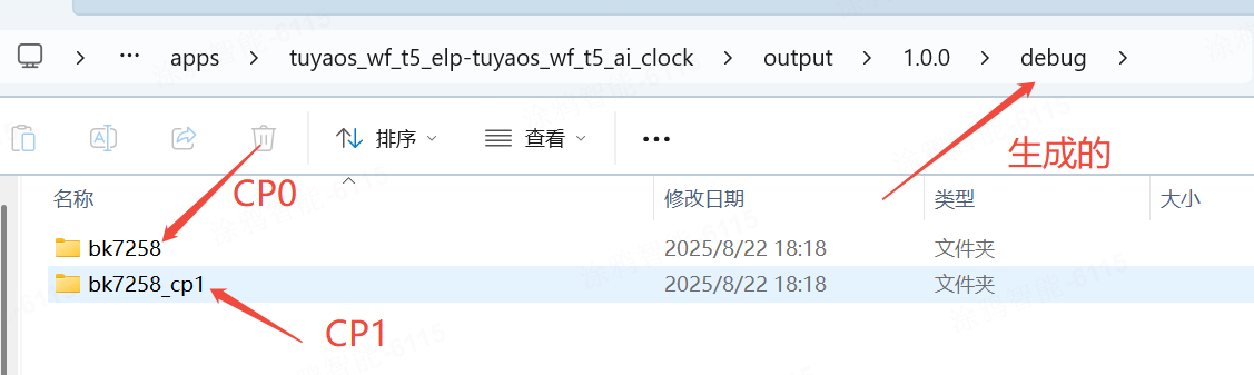 3.在T5_TuyaOS-3.12.7\software\TuyaOS创建一个debug文件夹,用于放客户的elf文件(死在哪个CPU就用对应CPU底下生成的elf文件),elf文件是在你编译代码以后生成的文件,如下路径:apps\tuyaos_iot_t5_gui_demo_product_class-T5_gui_demo_quickstart\output\1.0.0\debug