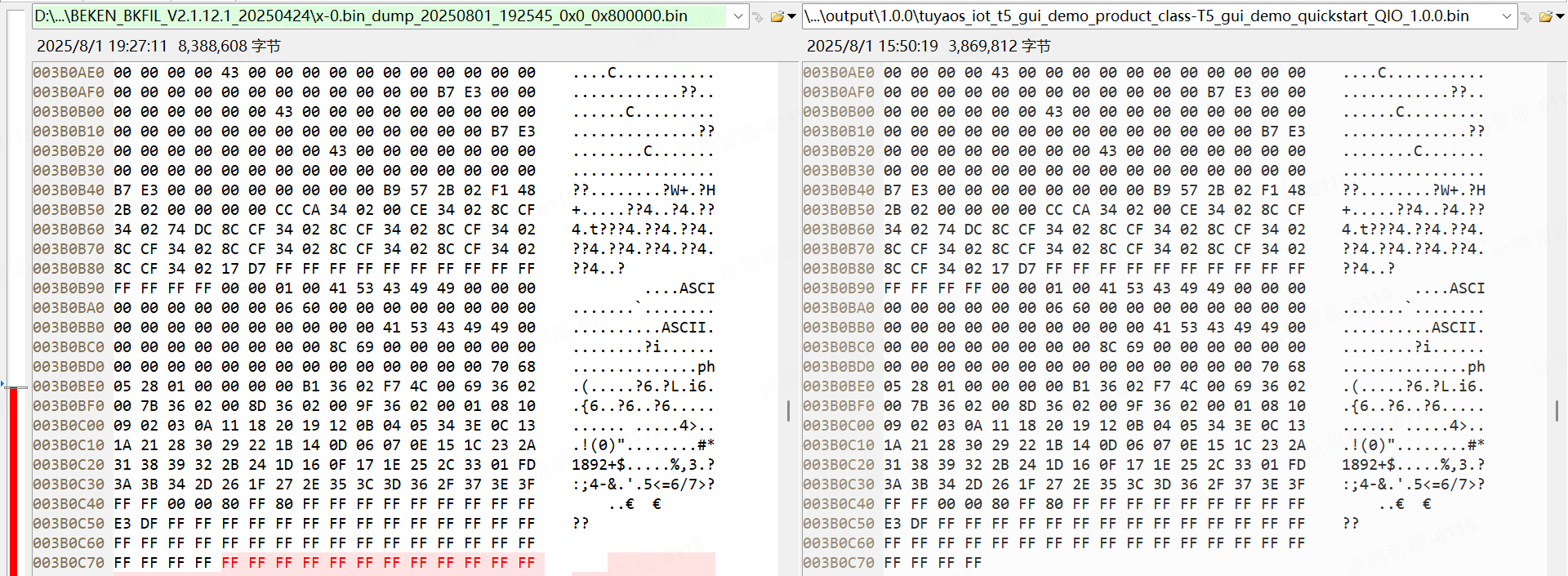 6.将导出的BIN文件和你自己编译生成的QIO_1.0.0.bin进行对比前面的3M数据(具体看你编译生成的QIO.BIN文件),看看有没有差异,如果有差异,那么说明烧入固件出现异常了: