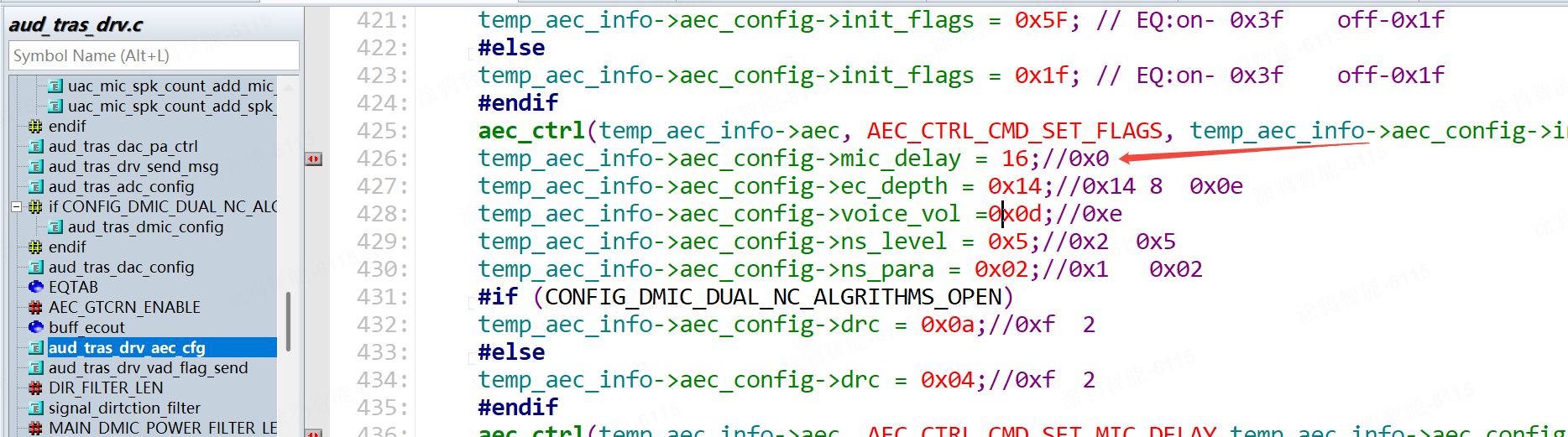 mic_delay(麦克风延迟补偿值) | 麦克风采集信号与扬声器播放信号的时间差(单位:采样点) | 0 (ms * Khz) | ○硬件延迟场景(如音频通过蓝牙传输、视频通话中音视频同步导致的延迟):通过分析 dump 数据中的回声信号与原始信号的时间差,设置对应采样点(例如延迟 10ms,采样率 48kHz 时,延时 = 10×48=480 采样点,设为 480)。○若未校准,AEC 会因回声信号与参考信号 “不同步” 而失效,导致回声残留。 |