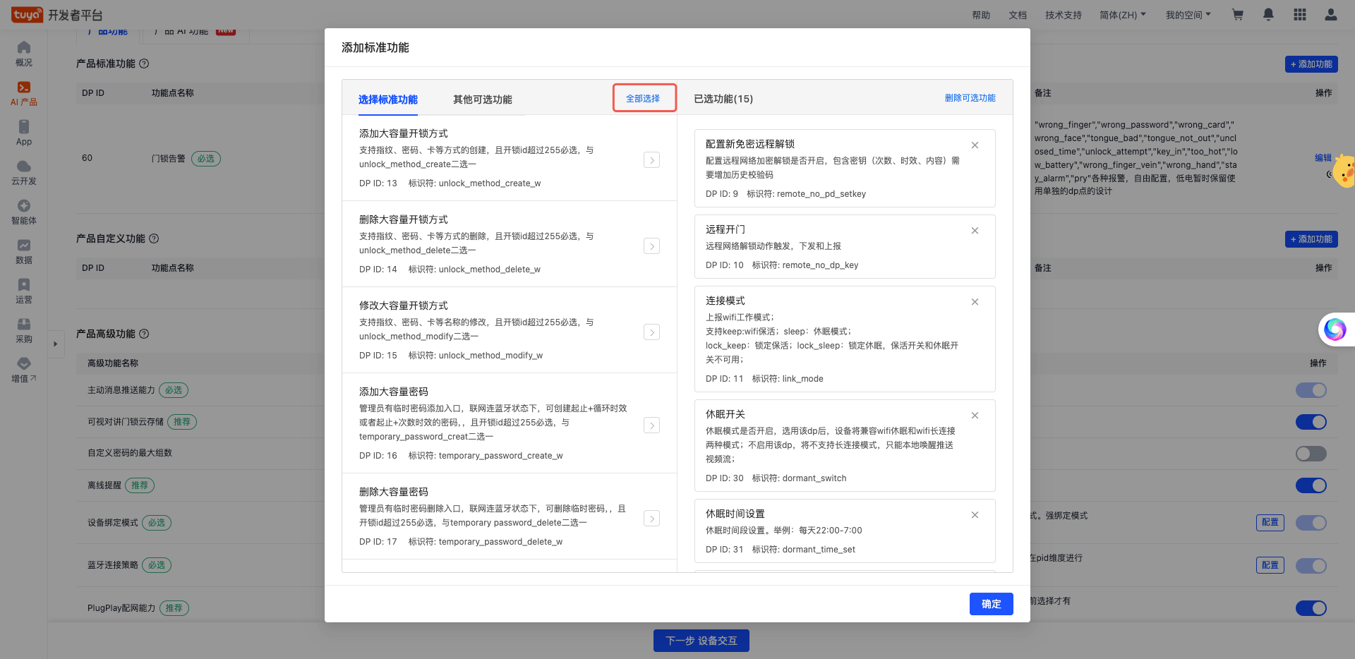 首先需要创建一个智能门锁类产品,定义产品有哪些功能点,然后在面板中一一实现这些功能点。
