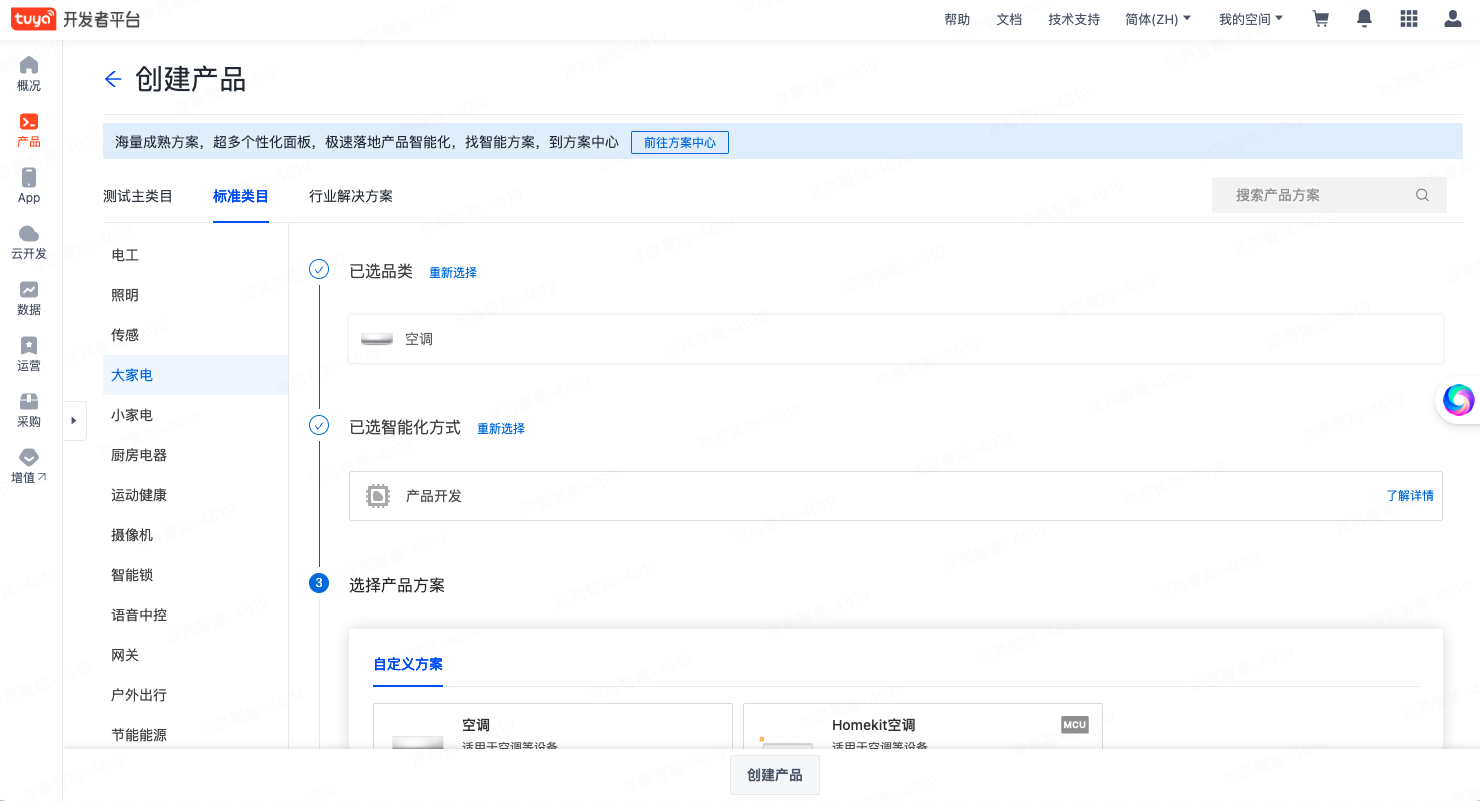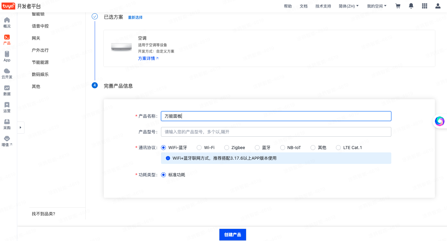 由于产品定义了面板和设备所拥有的功能点,所以在开发一个智能设备面板之前,首先需要创建一个产品,定义产品有哪些功能点,然后再在面板中一一实现这些功能点。