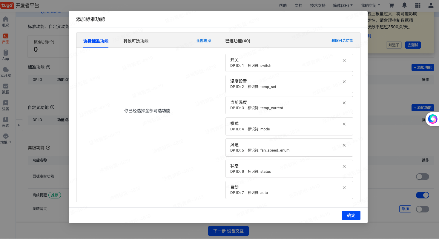 产品创建完成后,进入到 添加标准功能 页面,这里列出了空调类目下可选的标准功能。单击 全部选择,然后单击 确定 完成产品初始功能点设置。