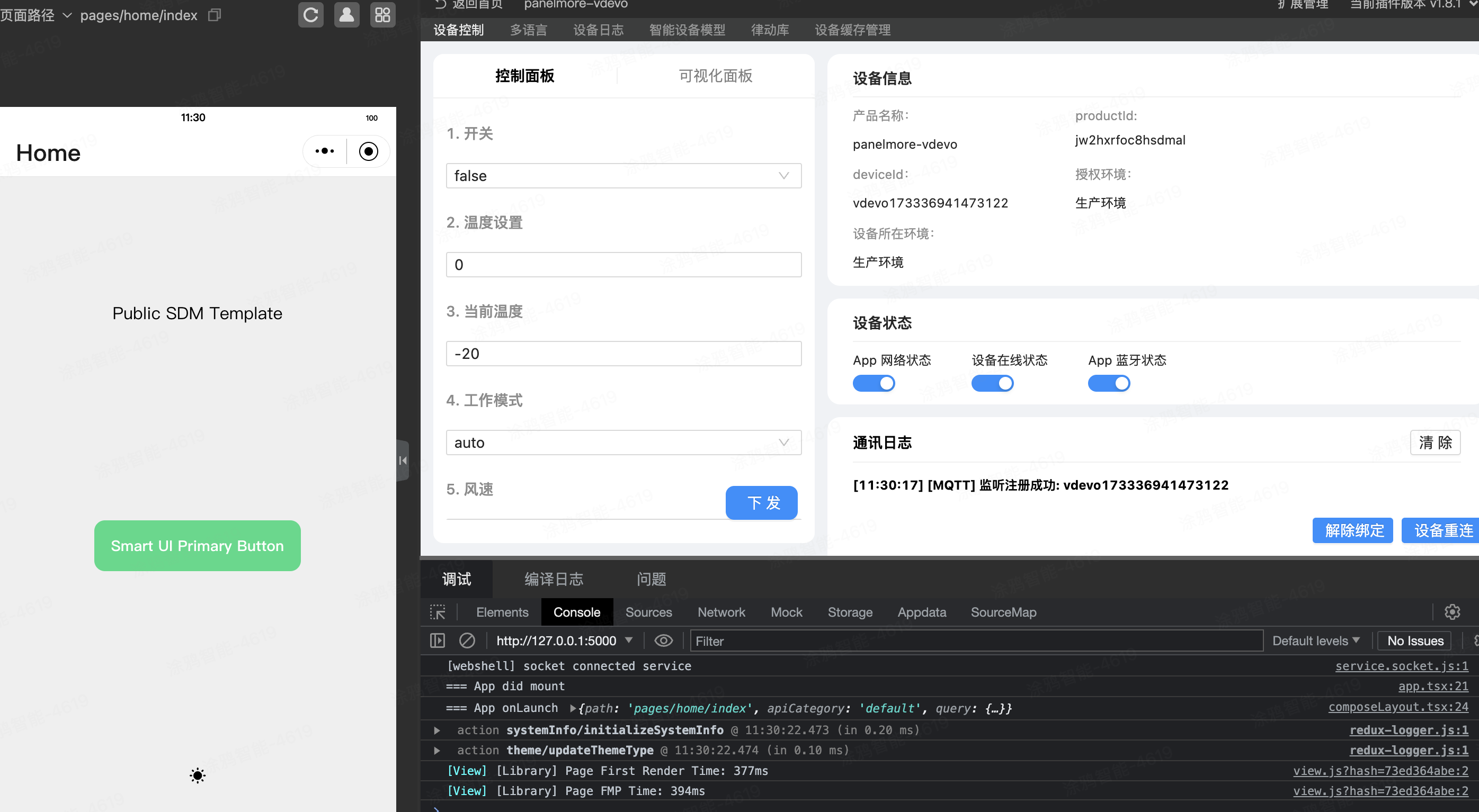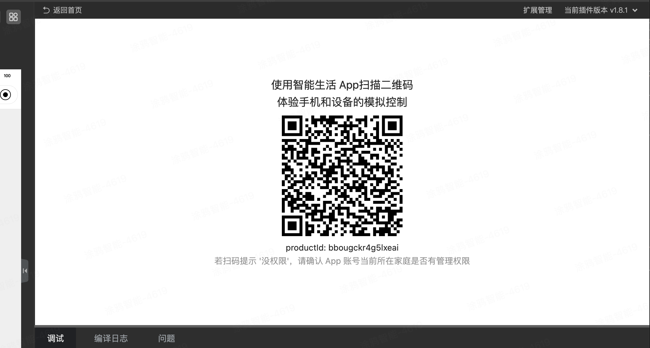 使用 智能生活 App 扫描二维码,打开并进入小程序面板,可以在真机上进行调试万能面板。