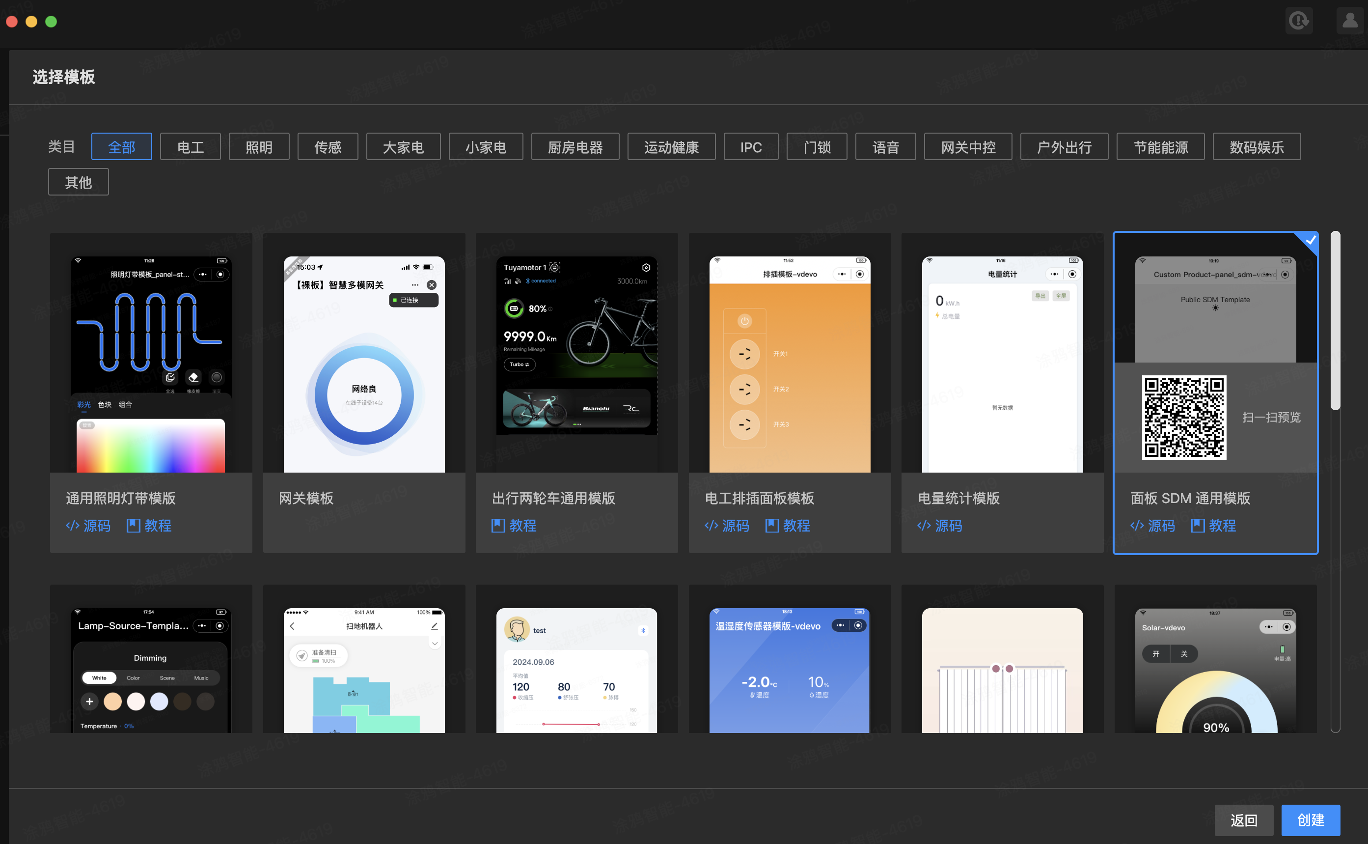 登录后进入 万能面板 项目,单击调试工具 Virtual Device,使用 智能生活 App 扫码创建虚拟设备。