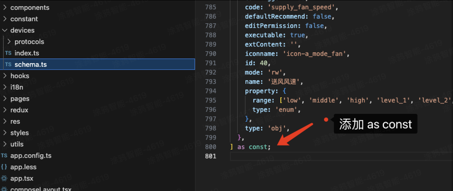 src/devices/schema.ts 文件,在生成的 Schema 列表后设置 as const,以便于类型提示,并在 src/devices/index.ts 中使用 deviceSchema 类型。