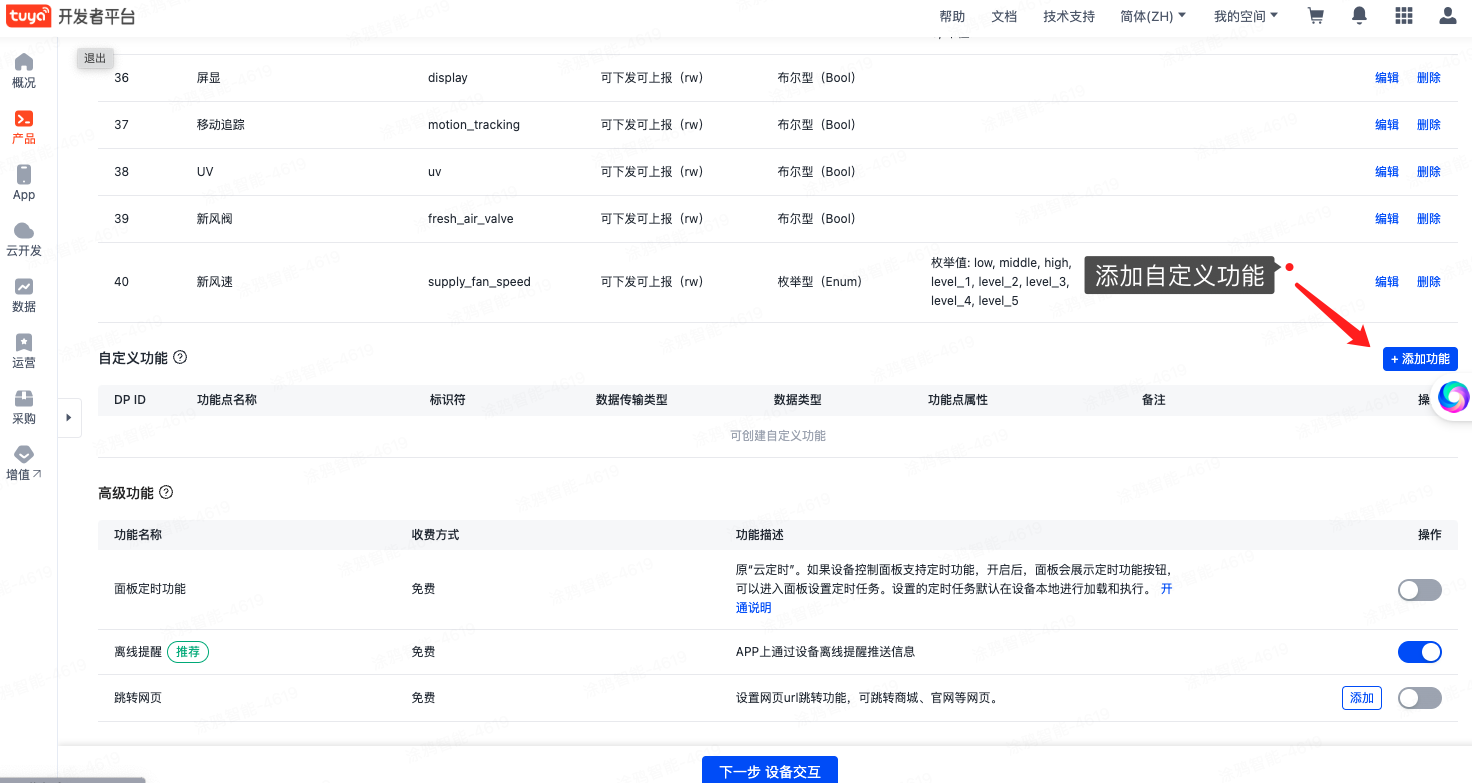 以上 Schema 中是家电类目自带的标准 DP 点,还可以增加自定义的 DP。在开发者平台,进入到产品的开发页面 > 功能定义 > 自定义功能 区域,单击 添加功能。
