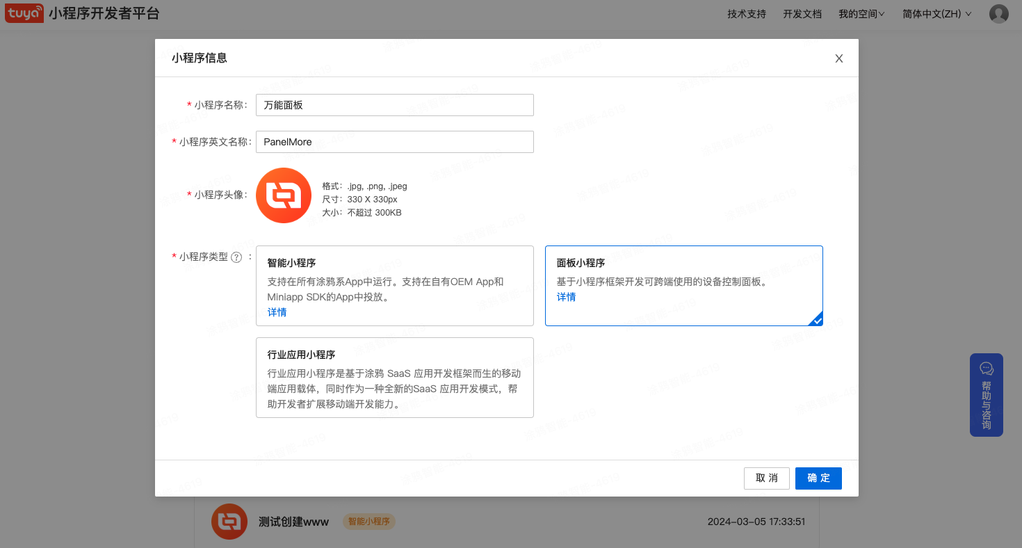 单击 新建,然后在 小程序信息 页,填写 小程序名称 为 万能面板,小程序类型 选择 面板小程序,然后单击 确定 完成创建。