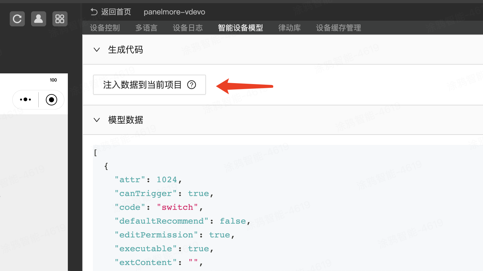 codeIds: 一个对象,key 是 dpCode,值是 dpId。devId: 设备的 id,虚拟设备会以 vdevo 开头。deviceOnline: 设备是否在线。dps: 一个对象,key 是 dpId,值是 DP 的状态。idCodes: 一个对象,与 codeIds 相反。panelConfig: 面板配置,其中 bic 是云功能配置。productId: 当前设备绑定的产品。schema: 产品的功能点定义,其中描述了 DP 的 code、类型、值范围属性、icon 图标。state: 一个对象,key 是 dpCode,值是 DP 的状态。ui: 面板的 uiId。通常代码中获取 devInfo 是通过 useDevInfo API 来读取。(本文中的 DP 即 "功能点",来自开发者平台功能定义。)