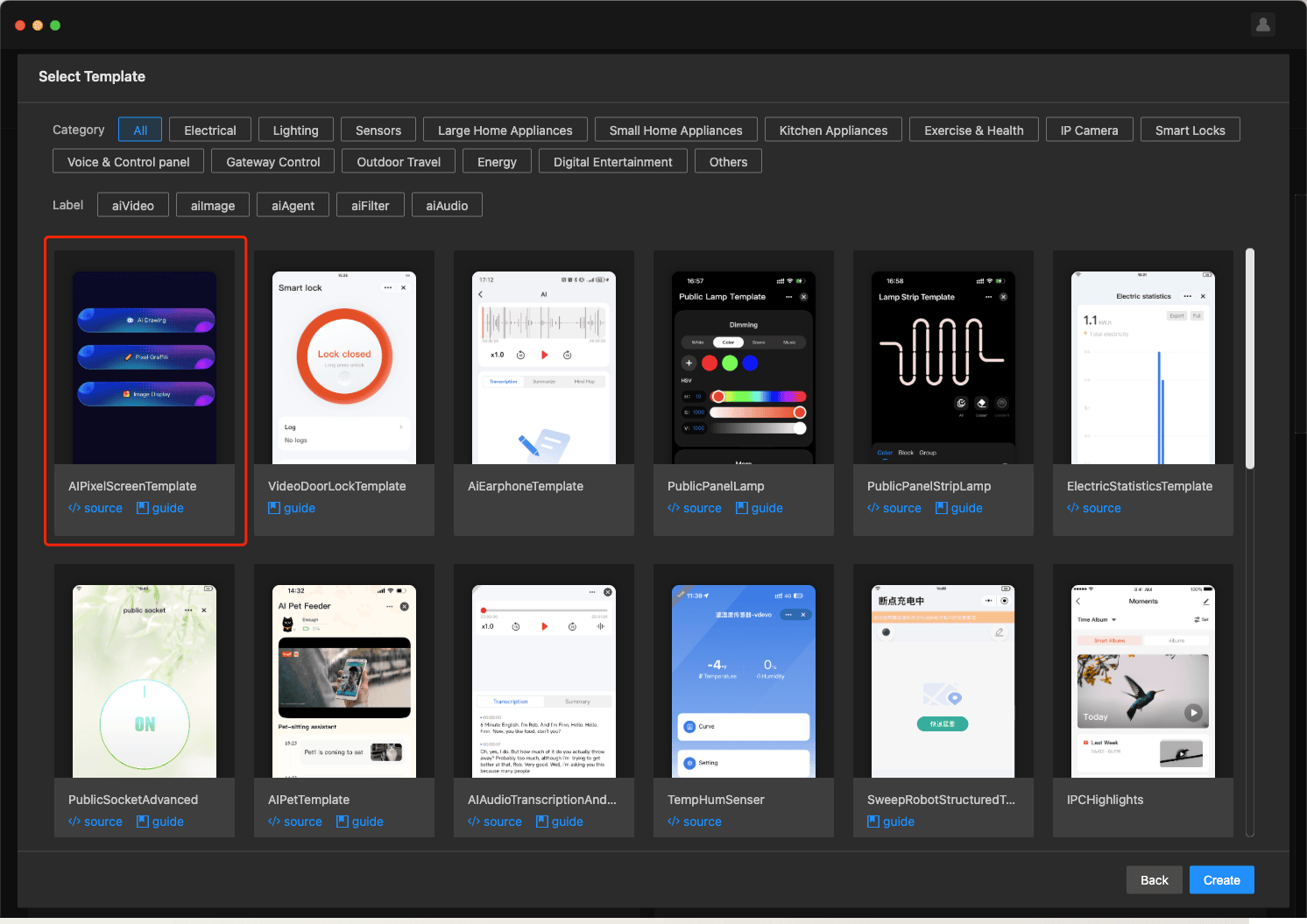 Open the Tuya MiniApp IDE, create a new panel project in the IDE, and select the AI Pixel Screen Text-to-Image Template to quickly create the project, as shown in the image below: