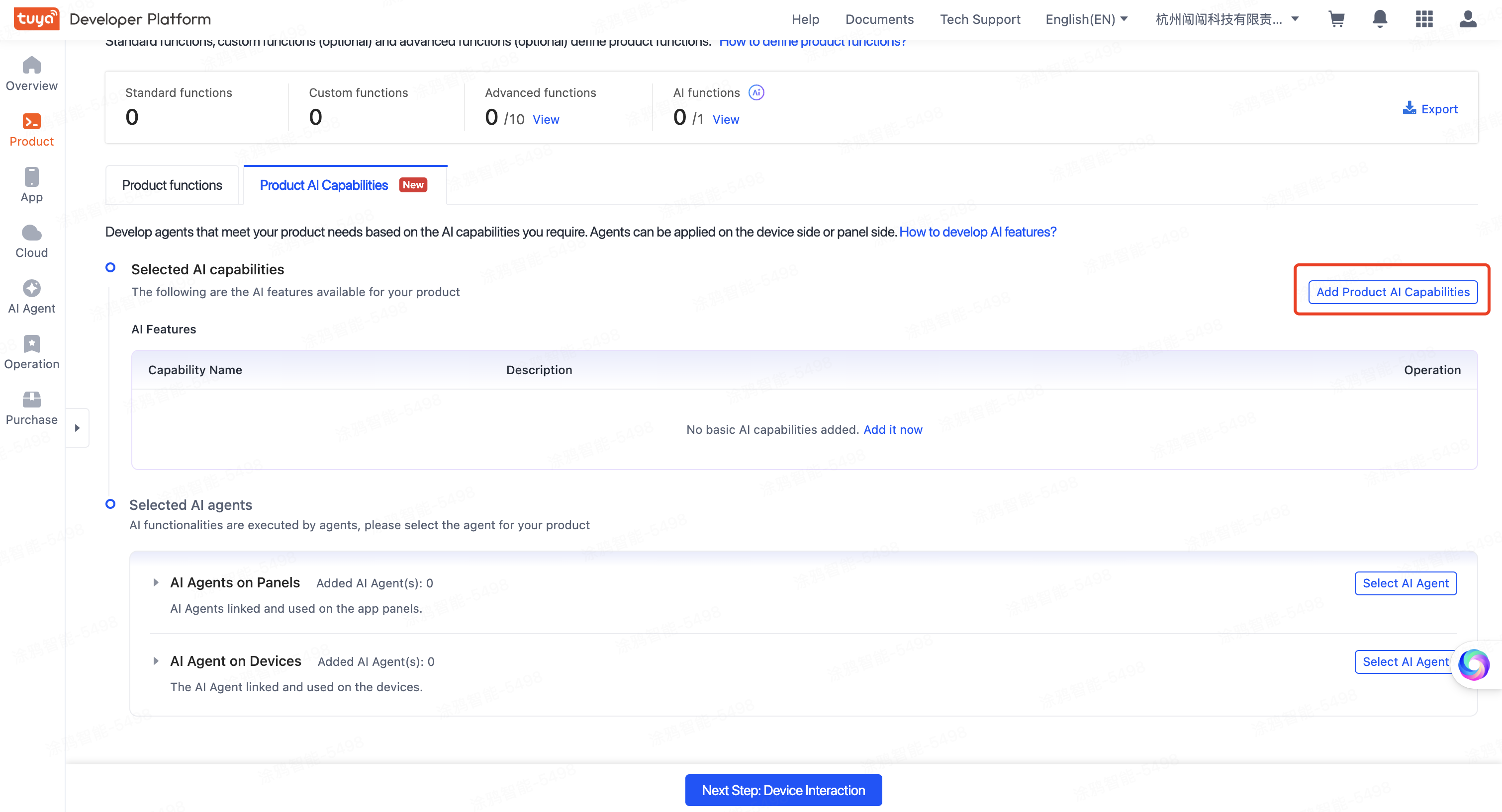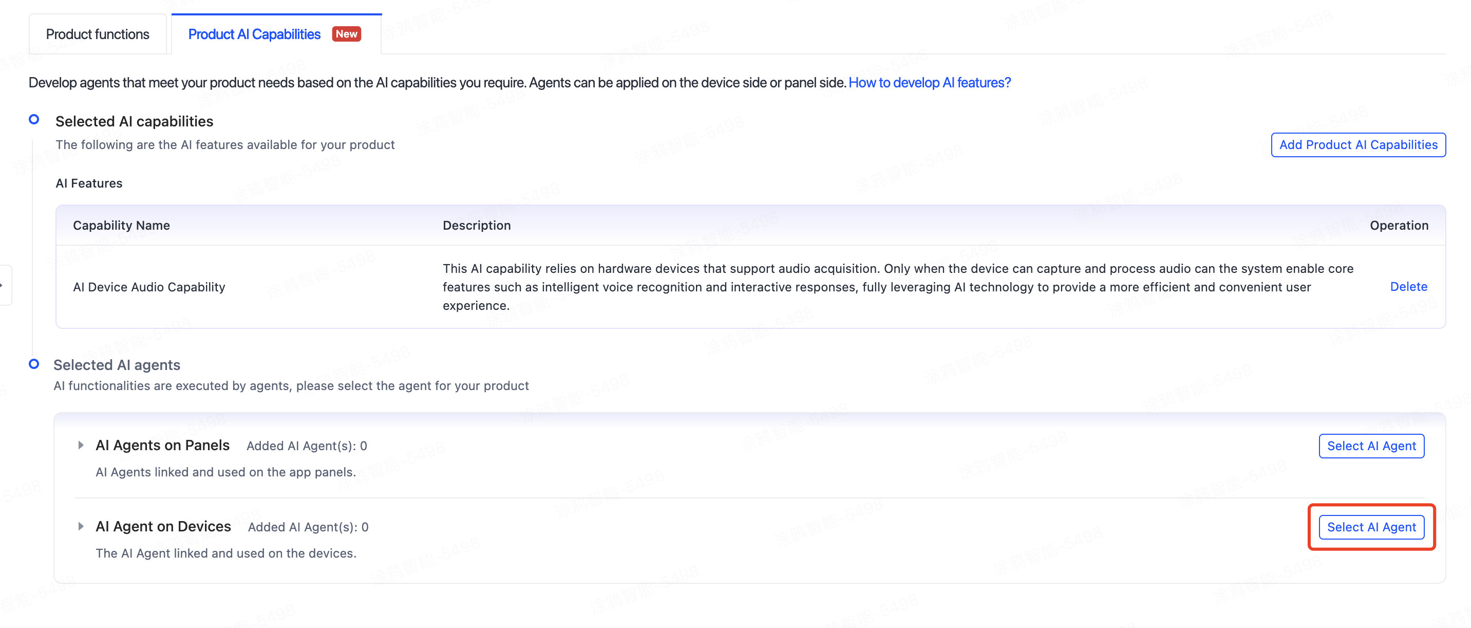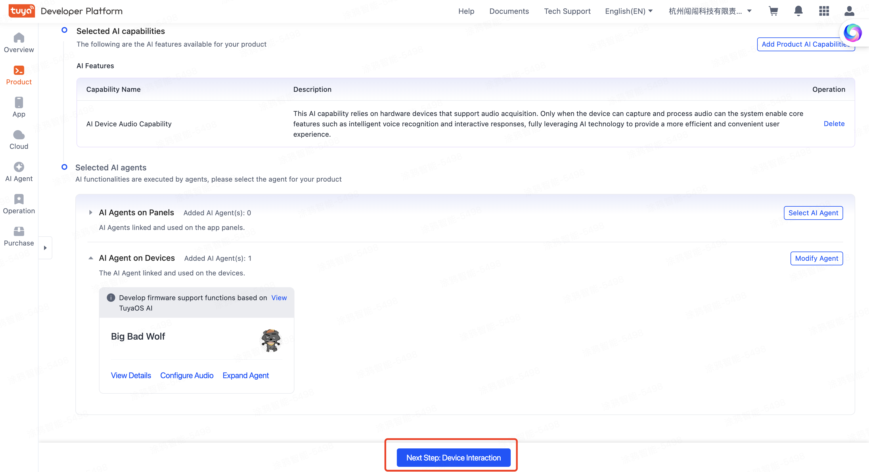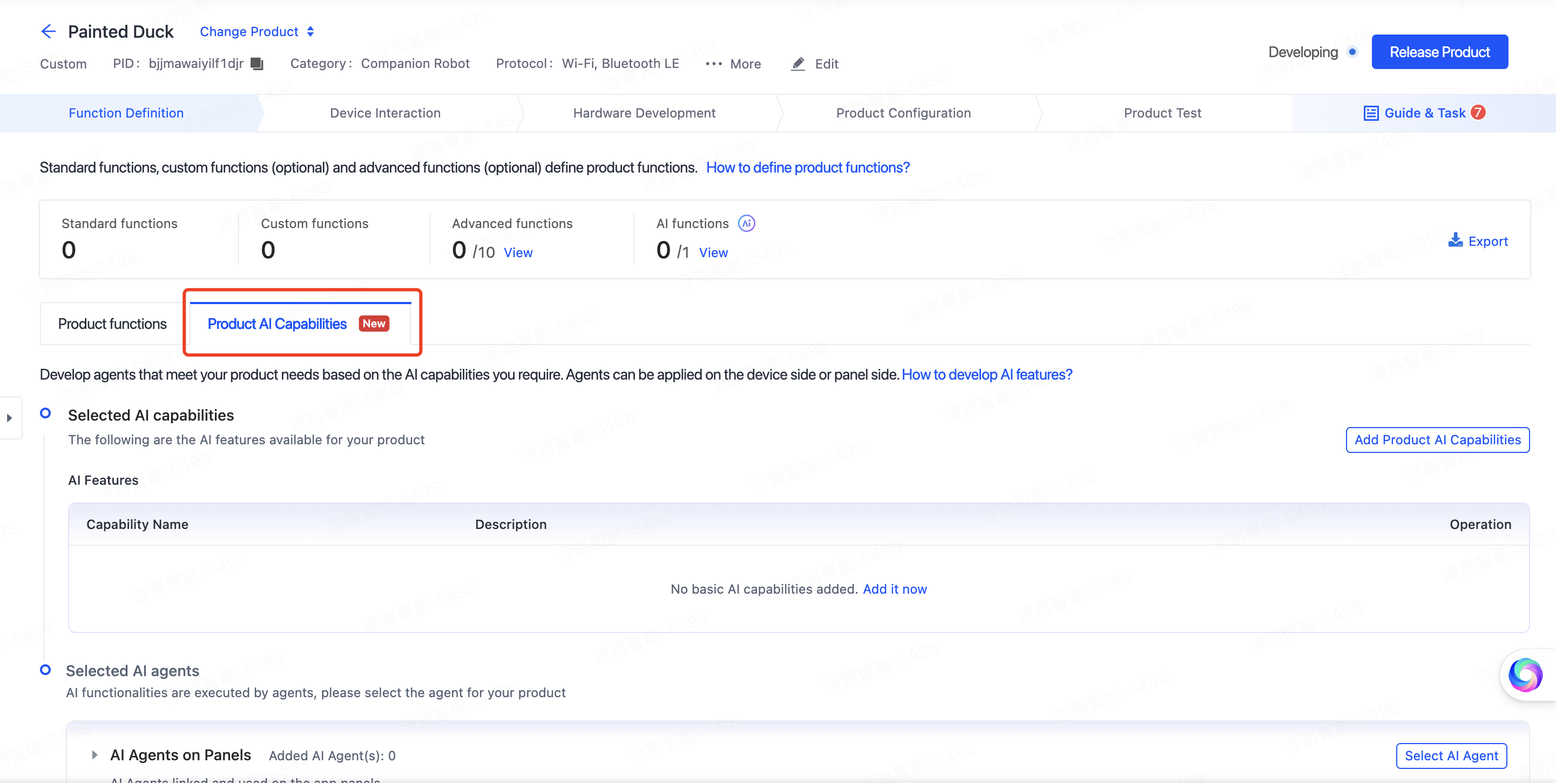 A product defines the data points (DPs) and agents carried by the panel and the device. Before you start panel development, create an AI plush-toy product, define its DPs, associate the required agents, and then implement these DPs in the panel.