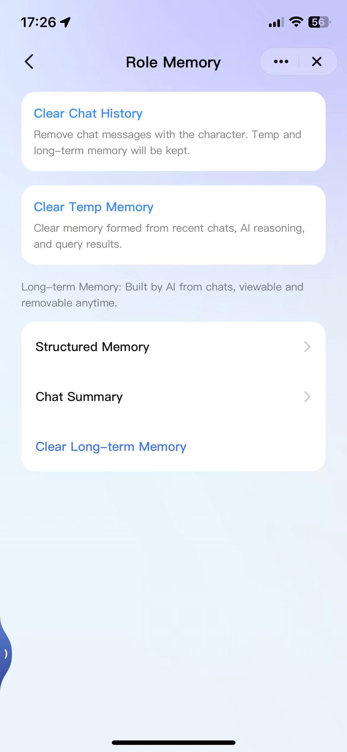 Manage role memories, including clearing chat history, removing temporary memories, structured memories, conversation summaries, and long-term memories.