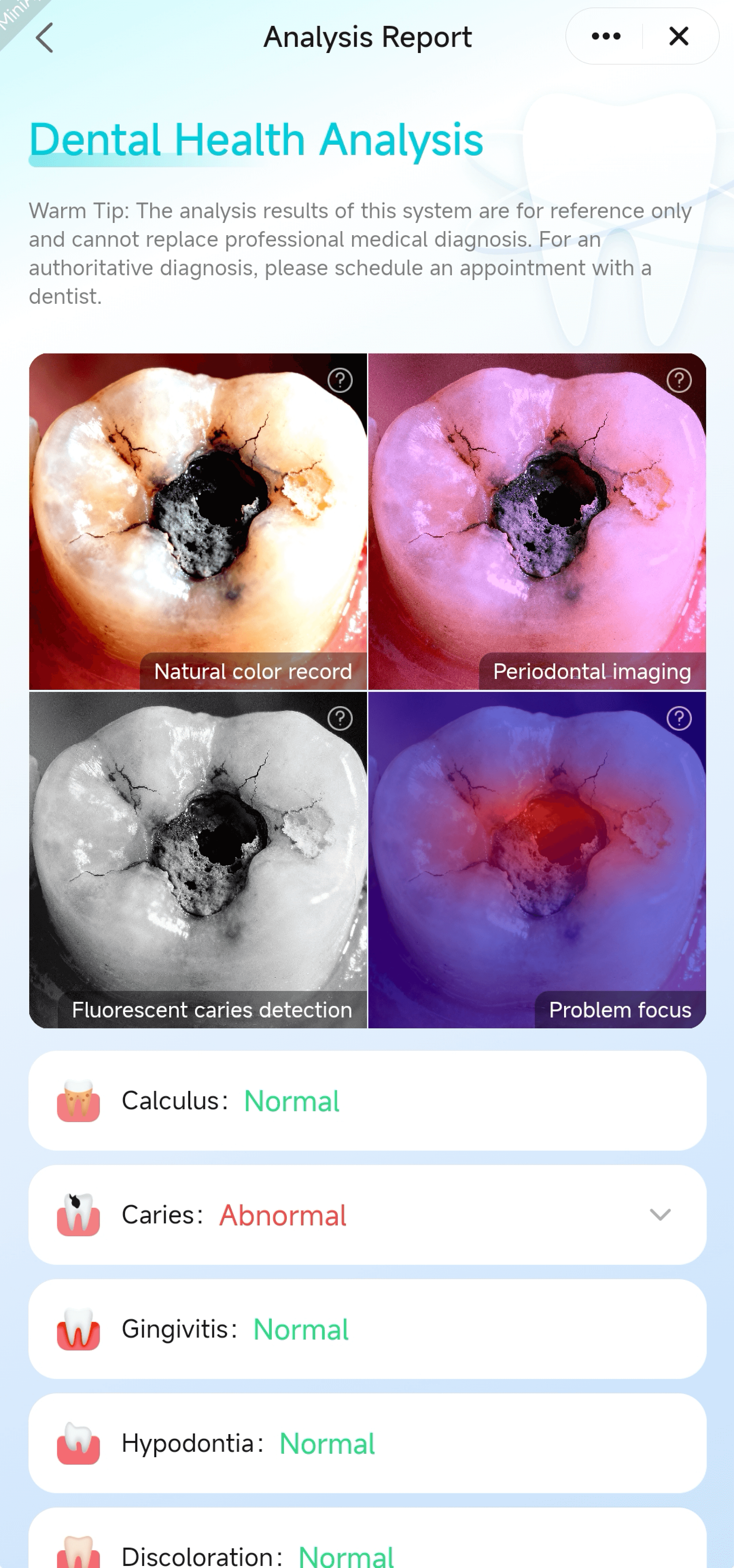 By performing AI analytics on the images, it detects oral diseases, processes the image to show heatmaps, and provides treatment recommendations.